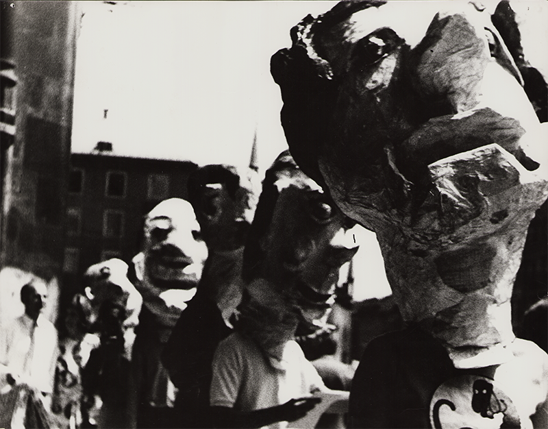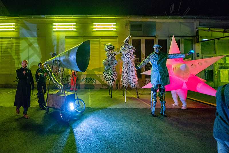 Straßentheater. Schwarze hohe Stelzenfiguren. Performerinnen und Artisten auf Stelzen und zu Fuß. Ein Wagen mit Live-Schlagzeug, gefolgt von einer Live-Brass-Band. Ein überdimensionales Megaphon. Eine Pferdeskulptur auf Rollen mit Reiterin und einer Live-Performance-Show.