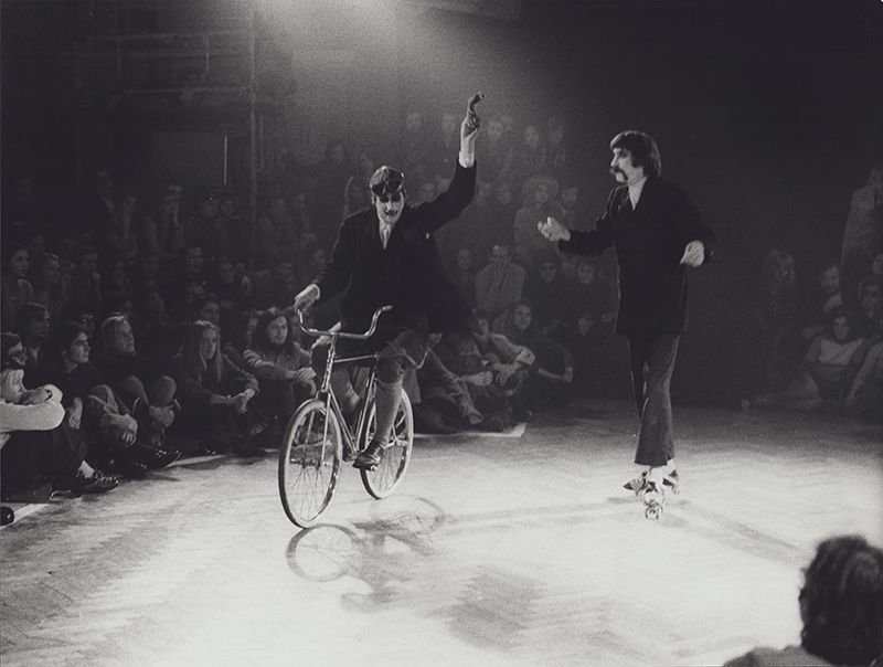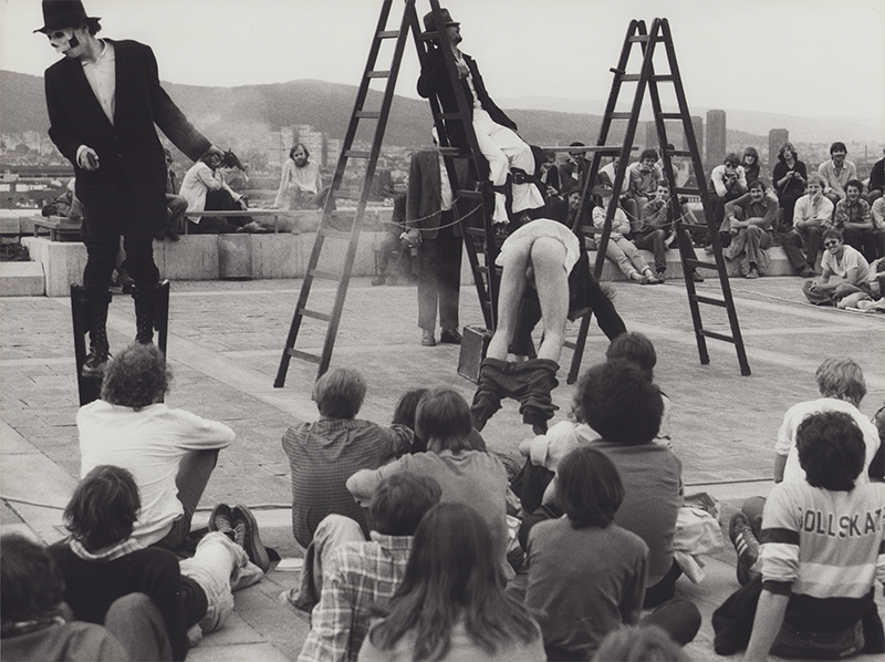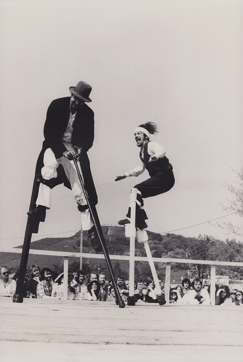 Erste Straßentheater-Versuche auf Stelzen